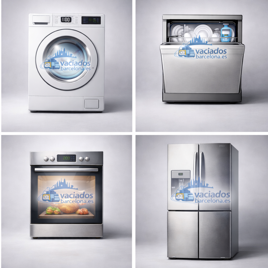 Ofrecemos servicio de retirada de electrodomésticos en Barcelona. Recogemos frigoríficos, lavadoras, secadoras, hornos y pequeños electrodomésticos. Servicio rápido, presupuesto gratuito y gestión responsable de residuos.